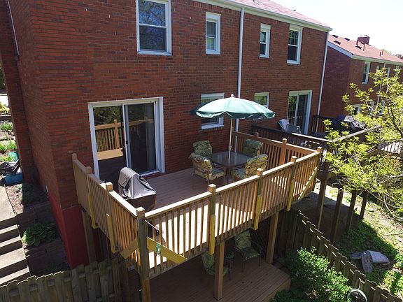Nice rowhouse near Brentwood Park with great outdoor space including covered front porch, large deck off the dining room (with new planking), and covered porch off the finished lower level (also with new floor planks). The living room features newly refinished hardwood floors, and the kitchen is updated with a gas stove, dishwasher (2019) and microwave (2018). Lots of light in the dining room, with it's sliding glass doors leading out to the large deck overlooking the deep backyard. There are two nice sized bedrooms on the second floor along with a full bathroom. The master bedroom has a ceiling fan with remote, but the house does have central air! The basement has a laundry room with washer/dryer included, plus a finished gameroom. New downspouts, and gutters were just cleaned. Close to town/public transporation. One block to Library! Ample street parking. Back lower porch screen door & frame will be replaced and the home will be cleaned, and is sold as-is. HSA Home Warranty included.