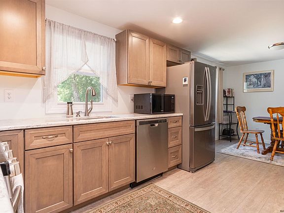 This is it...spotlessly clean and nothing to do with this one floor charmer. This home has a new kitchen with ss appliances, quarts top and new flooring along with an updated bath with a beautifully tiles tub/shower and all new carpets in the bedrooms. There is plenty of room to store your stuff with a dry basement, 2 car detached garage and a shed. Be the place for the back yard BBQs with the super large flat back yard. All located in the Burnt Hills School District in a family friendly neighborhood.