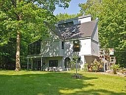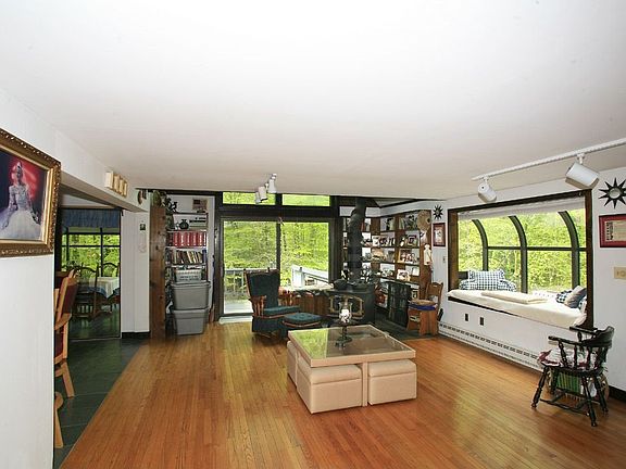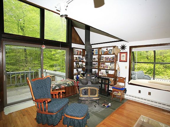 This house is situated deep in a 12 acre wooded lot where the closest neighbors are deer, squirrels, wild turkey and an occasional fox. The rustic Contemporary design offers windows and decks at varying levels to appreciate the natural flora and fauna. The main level begins with a great room featuring a wood burning stove and an abundance of bookshelves, an atrium window seat is an ideal place to get lost in a book or take a nap. An angled breakfast bar also serves as a social center between the warmth of the wood stove, the kitchen and the adjoining formal dining room in the solarium. A deck, full bath and a laundry room complete this level. Upstairs, the main bedroom, with vaulted ceiling, offers a dressing room, walk-in closet, private bath and sauna. Two more bedrooms can be found on the ground level along with a wood paneled den and full bath. An out-of-sight attached 6 car garage is amply suited for a workshop, hobby center or a home business.