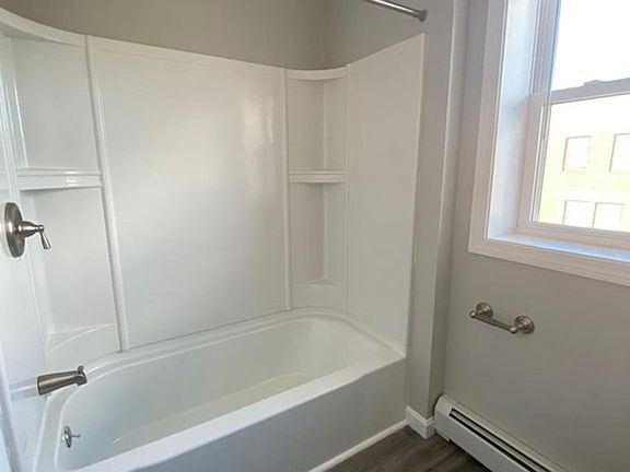 Beautiful kitchen with ample new cabinets, electric stove, microwave above the stove, garbage disposal, microwave, dishwasher and refrigerator, large island with beautiful easy care flooring. Bright living space with hardwood flooring and fresh paint. Modern bathroom with new fixtures and oversized vanity with drawers. Laundry closet is ready for your washer/dryer units. New efficient heating and hot water system. The building was completely renovated three years ago! No smoking (tobacco, marijuana or vaping) allowed inside building. No Pets*, One year lease required. First months rent, last month's rent. Security Deposit equal to the rent and a $100 lock fee required to move in. (Photos may be of similar apartment in building)