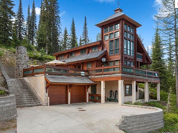 "The Overlook", located in The Spires at Schweitzer Mountain. This gorgeous log home constructed of energy efficient Finnish logs features 4 bedrooms, 3 baths, views of Lake Pend Oreille, hydronic heat, concrete flooring throughout, two car garage and ski in/ski out access all surrounded by expansive decks and patios to enjoy those views. Gourmet kitchen with granite counters and stainless steel appliances opens up to living and dining rooms. Top floor Master Suite with walk-in closet and the Tower Room with vaulted ceilings, huge windows and deck. Lower level features entry space with ample ski storage, guest bedroom, bunk room, full bath with the Finnish dry sauna, laundry room. The Spires, Schweitzer's premier gated community has 50 acres of terrain to enjoy on your ski back home and groomed ski trails to the Schweitzer Village.