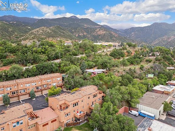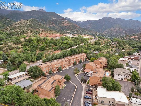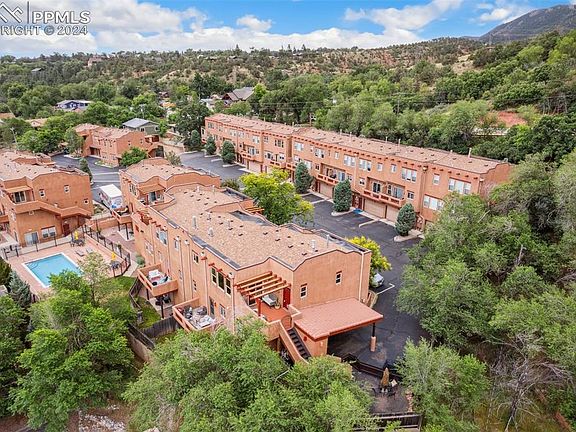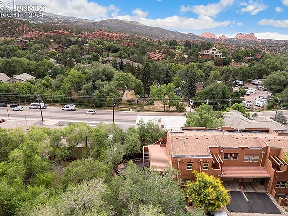 Discover serenity and charm in this meticulously crafted 2-bedroom, 2-bathroom condo nestled in the heart of Manitou Springs. Spanning 1,284 square feet, this end unit offers privacy and stunning Southwest-style details throughout. Step into the open-concept living area, where concrete heated floors lead you to breathtaking views of surrounding mountains and the iconic Garden of the Gods from large windows and an upper deck. The adobe-style gas fireplace creates a cozy ambiance, complemented by charming wood trims and rustic earth-tone tiling. The kitchen is a chef’s delight with shaker-style wood cabinets, stainless steel appliances, and elegant copper trim details. Whether entertaining or simply enjoying a quiet evening, this space seamlessly integrates functionality with style. The primary bedroom boasts a walk-in closet, an en suite bathroom with a jetted tub, a linen closet, and a private patio offering mountain views. Additional features include a carport, additional parking spaces, storage closet in carport and extra storage under the outdoor staircase. Residents will appreciate the multiple options for outdoor enjoyment whether it be the community pool or one of the home's three private outdoor patios perfect for gatherings or morning coffee and a book. Located near Garden of the Gods, Manitou Incline, and downtown Manitou Springs, this condo offers not only a home but a lifestyle surrounded by natural beauty and cultural attractions. Embrace the essence of Colorado living with this unique property that combines modern comforts with distinctive Southwestern allure.