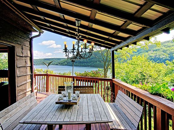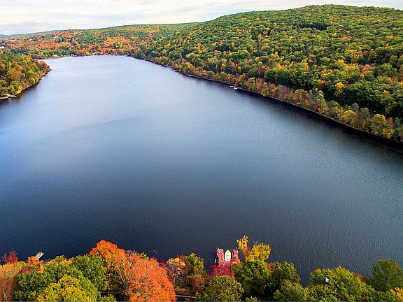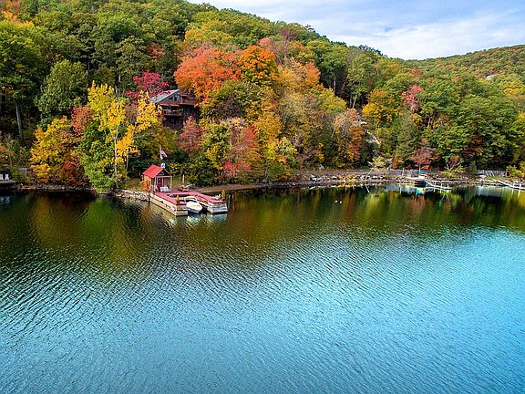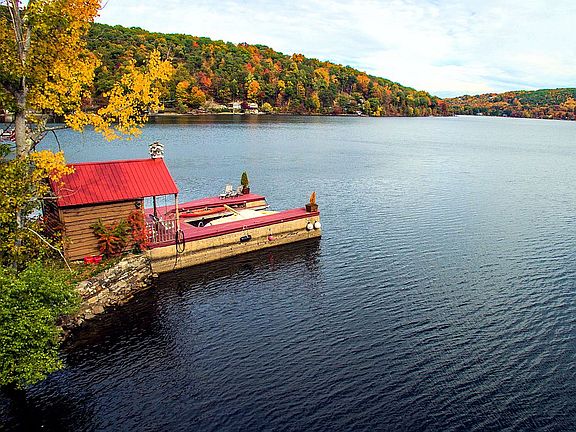 Located on the most desirable lake in Connecticut, The Victoria Lodge at Marks Hollow Point includes a Chalet style primary residence with wraparound deck and panoramic lake views, a Guest Cottage with 2 bedrooms a full bath and screened porch, a 26 ft. boat slip, and a boat house that sleeps four. Set on one of the largest water frontages on Lake Waramaug at over 200 ft., the property offers the longest jaw-dropping views of Lake Waramaug and the ever-changing foliage of the Litchfield Hills. This unique New Preston property can be enjoyed as a year-round family compound or as the ultimate weekend getaway for large-scale indoor/outdoor entertaining. Built in 1929, the "Lodge" exudes a rustic and historic charm only found in New England. The four bedroom chalet style main residence is situated on an expansive, naturally landscaped property, which is shared with the "Cottage House," a smaller two bedroom building that can be used as a three-season guest house or offer an income opportunity as a vacation rental. In total, the property can comfortably accommodate 16 people, dock up to four boats, and park up to ten cars. This offering is the last of its kind on the lake and also includes a small separate lot.Irreplaceably located just minutes away from the historic shopping village of New Preston.MAIN RESIDENCEThe Chalet style main residence sits atop Tinker Hill with views of Lake Waramaug from nearly every room. The expansive wraparound deck with lounge and covered dining area is perfect for al fresco dining or soaking in the sun. Inside, the spacious layout features multiple living spaces. A massive stone fireplace and built-in bookcases make for a cozy, inviting gathering space any time of year. A master and guest bedroom each offer ensuite baths and private terraces with generous views of the lake. After an unforgettable day on the lake, refuel with a meal prepared in the open country kitchen, equipped with tiled countertops and stainless steel appliances. Later, stroll down to the water with a nice glass of wine while you admire the breathtaking foliage and lake views. BOAT HOUSE & BOAT SLIP Perhaps the best feature of this home is its enviable outdoor space and amenities--with 200 ft. of stunning Lake Waramaug waterfront, stone steps leading into the water, a deep water dock with swimming platform and boat slip, the lake is practically all yours. Go swimming, kayaking, fishing, or take the boat out with friends any time you like. The boat house accommodates up to four with a wood burning stove and electricity. A grassy picnic area with stone grill will keep the party going long after sunset. Marks Hollow Point is the largest cement boat dock on the lake, this means it can stay out year-round, and the wake from other boats will never disturb you. Along the frontage, there's plenty of room to moor other boats.GUEST COTTAGEThe ultimate guest house with two bedrooms and full bath, updated kitchen and large screened porch. Close to the main residence, but private with separate entrance and parking, allowing guests to come and go without disturbing the main house. Though it has been rented occasionally for more than $1,000K/week, the owners prefer to use it for friends and extended family. For large parties, the second kitchen is perfect for private chef dinners or overflow from catering events. The garage is currently used for storage, but could be converted to a studio or gym.