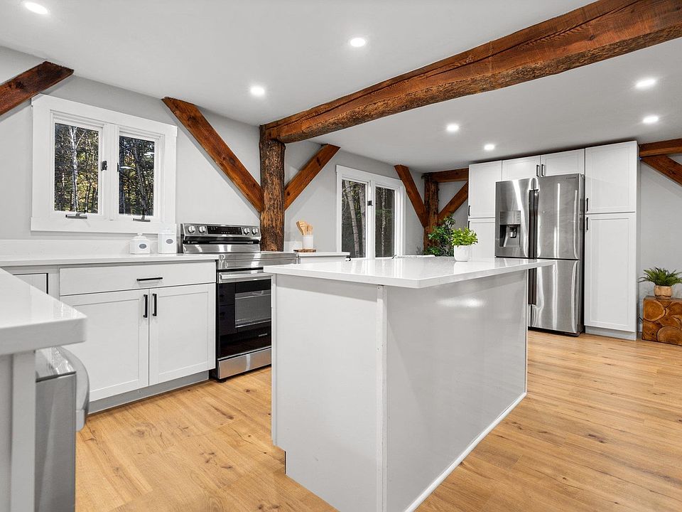 Welcome to your own slice of Heaven! This sunny, updated home is brimming with charm and character, featuring exposed beams and an abundance of natural light. Recent upgrades include a new energy-efficient gas furnace/water heater combo, a stylish kitchen with quartz countertops, stainless steel appliances, new flooring, fresh paint thru out the house, a beautifully remodeled bathroom with a shower and has a metal roof. The first floor offers a cozy living room, a family room, a mudroom, bathroom, and a kitchen with a dining area. Upstairs, you'll find three bedrooms and a full bath, while the top floor features the fourth bedroom with nature views. Outside, a chicken coop/large shed, and carport provide excellent storage options. Nestled in a private setting, this home is just a half-hour drive from Concord and Keene. Don’t miss out on this charming gem! Home warranty included, agent interest. Open house on Sunday 10/20 at 12:30-2:00pm.