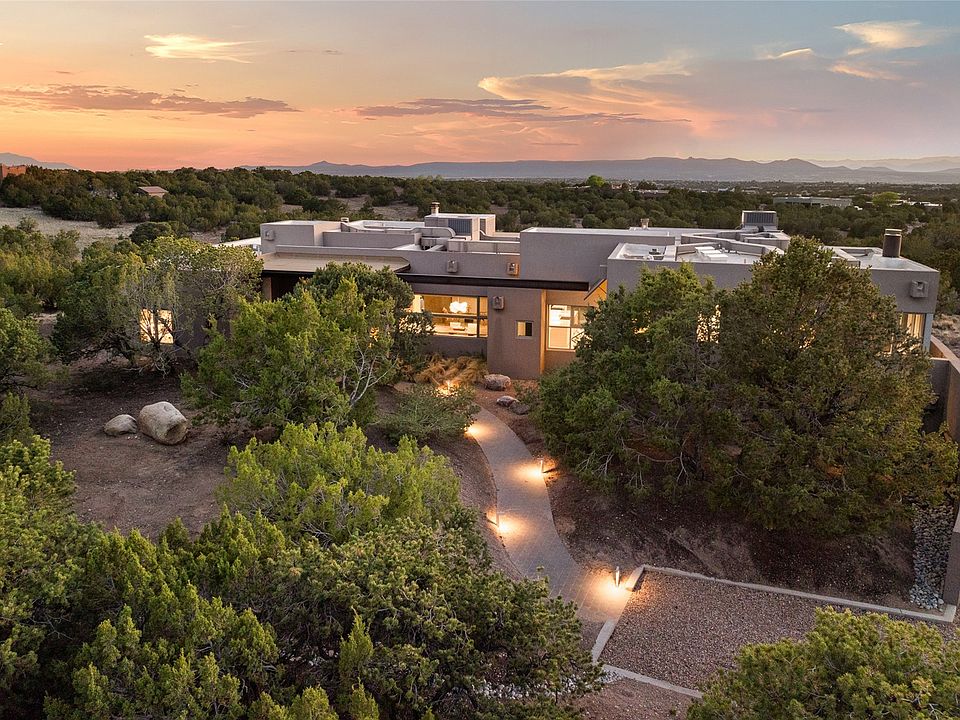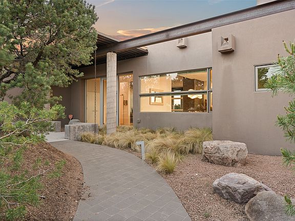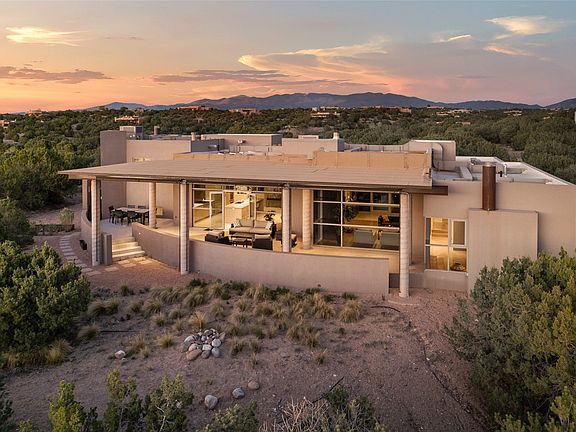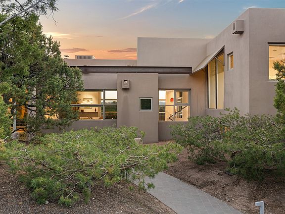 Welcome to this stunning, contemporary Open Concept, split-level home with 3 Bedrooms, 2 Offices, 3.5 Baths, Wine Storage, 3 Fireplaces, 2-Car Garage plus Panoramic Jemez & Sangre de Cristo Mountain views in 3,600 square feet, on 2.8 acres, in the Vallecito neighborhood, off West Wildflower, adjacent to Las Campanas. The home was originally designed by award-winning architect Jeffrey Harnar and in 2015-16, it was renovated by Architect Robert Zachry & contemporary Builder Michael Hurlocker. The Living Room features a wall of glass to the Jemez Mountain view, plus a fireplace w/ a striking Venetian Plaster finish. The centerpiece of the Kitchen is a massive 4' x 12' island, w/ large single-basin sink, dishwasher, trash compactor & room for 5 bar stools. There's also a Thermador gas range top, wall oven, microwave, warming drawer & 4-foot Sub-Zero refrigerator. The Dining area has 10 feet of double-stacked panoramic windows to the Sangre de Cristo Mountain view. The Master Bedroom, up a half-flight of stairs, is a haven in itself - Wood-burning fireplace, finished in striking Venetian Plaster, windows on 3 sides with views to the Sangre de Cristo Mountains, access to a sunny outdoor deck, plus a spacious walk-in closet. The Bathroom provides a soothing spa experience - Steam shower, double sinks & free-standing tub. A Private Office / Art Studio is conveniently located on the same level. Two private Guest Bedrooms on the opposite side of the home have en-suite baths w/ a shower & double sinks. On the same level as the 2-Car Garage is a 220-bottle Wine Storage area, Laundry Room, plus another Private Office / Art Studio. The spacious 2-Car Garage has ample shelving & an epoxy floor. The Back Portal is equally extraordinary, with separate areas for "Wining & Dining," plus a Panoramic Jemez Mountain View. This home has it all - Contemporary flair, 3 Bedrooms, 3.5 Baths, 2 Offices or Art Studios & views of Both Mountain ranges. Call today for an Appointment.