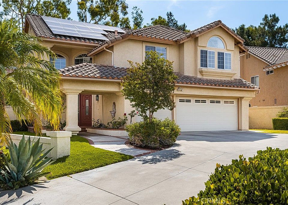 Live the California lifestyle that you've always dreamed of in this wonderful home in the hillside community of Foothill Ranch. You will enjoy this very private and tranquil pool-sized lot with a driveway that will fit 6 cars at the end of a quiet CDS street backing to a greenbelt slope. This exceptional home offers 4 spacious bedrooms, 2.5 baths, and a separate loft/workstation, with 2,756 square feet of comfortable living space for everyone. Entering the home through double doors you’ll find a large foyer leading to the formal dining room, a great room, or you can head up the grand curved staircase. The gourmet kitchen has been upgraded with granite countertops, and custom appliances, including a Viking stove, double ovens, a built-in GE Monogram refrigerator to match the custom cabinetry, a wet bar, and a butlers pantry with sink, wine cooler, and another expansive walk-in pantry. The adjacent breakfast nook and family room with a custom stone fireplace are perfect for family gatherings. The downstairs powder room and mudroom are off the direct access to the attached 3-car garage. The primary suite with retreat boasts high ceilings and a remodeled bathroom with a walk-in shower, separate soaking tub, dual vanities, and an oversized primary walk-in closet with custom organizers. There are three additional spacious bedrooms, a loft/workstation, and a large custom laundry room with loads of counter space and a convenient sink. Custom upgrades include: travertine tile flooring, newer air conditioning, tankless hot water heater, ceiling fans, mirrored closet wardrobes, and seller-owned solar. You'll love spending countless hours in your private entertainer's backyard with a covered patio, a large wrap-around bar, Viking BBQ, a grass area, and a sunny side yard which is a wonderful space for a victory garden. This home has it all. Hurry on this one it won't last long at this price!!