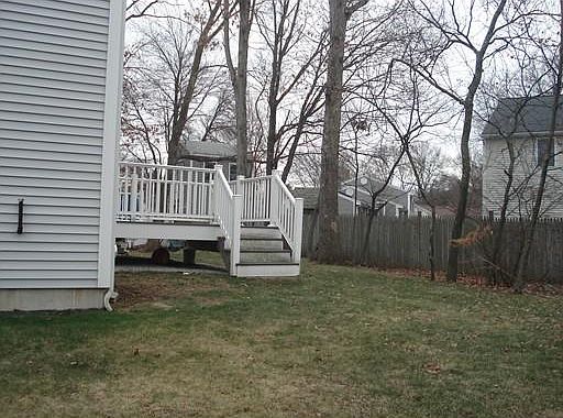 Mint condition townhouse with front porch entry-open floor plan,living room and kitchen with hardwood floors,and recessed lights-oak cabinets with granite counters-tile entry-half bath with tile floor and laundy area- slider to deck-hardwood stairs-three generous sized bedrooms with hardwood floors,walk in closet in master-large main bath with tile floors and tub-shower enclosure- central air-one car attached garage-large yard-