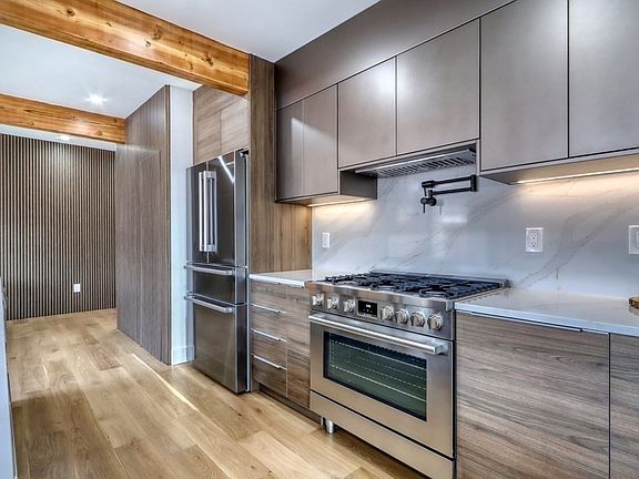 - Features: Beamed Ceilings, Closet, Closet/Cabinets - Custom Built, Flooring - Hardwood, Dining Area, Pantry, Countertops - Stone/Granite/Solid, Countertops - Upgraded, Kitchen Island, Cabinets - Upgraded, Exterior Access, Open Floorplan, Recessed Lighting, Slider, Stainless Steel Appliances, Pot Filler Faucet, Storage, Gas Stove, Lighting - Pendant