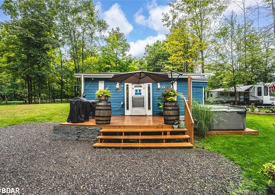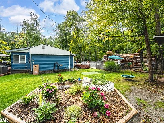 BEAUTIFUL BUNGALOW RETREAT ON A MASSIVE 150 x 100FT CORNER LOT WITH 3 DRIVEWAYS, GORGEOUS GARDENS & LANDSCAPING, A HOT TUB, ABOVE GROUND POOL & A 50 AMP BREAKER IN THE SIDE YARD JUST STEPS AWAY FROM GEORGIAN BAY! This super cute four season bungalow in Penetanguishene proves that great things come in small packages! With its mature trees, emerald cedars, luscious garden beds, and decorative landscape rocks, this outdoor sanctuary features a hardtop gazebo with a fire pit, an above-ground pool with wood stairs, a patio, a 10 x 6 ft deck, and a hot tub for the ultimate backyard experience. At the side, a 50 amp breaker is ready for RV use or future outbuilding power. This one-level home offers two bedrooms, a 3-piece bathroom with combined laundry, and an open-concept layout with a carpet-free interior, easy-care laminate flooring, and a calm, neutral colour palette. The functional kitchen offers grey cabinetry, a tile backsplash, and a large pantry for all your storage needs. Repainted blue vinyl siding, a newer front deck, and newer shingles add extra polish to this move-in-ready space. Close to downtown, schools, daily essentials, waterfront adventures, Discovery Harbour, and King’s Wharf Theatre, this little beauty with its backyard oasis is ready to steal your heart!
