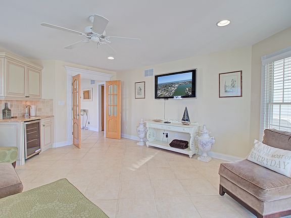 You will be very impressed with the absolute pristine condition of this home that belies it's 2003 construction date. The upside down design allows four generous bedrooms, two of which are fabulous master suites with adjoining baths. The entry foyer is sun-filled due to the double front doors, ample windows and open design. French doors invite you to a large family room with tile floors, wet bar with granite top, refrigerator and access to a welcoming covered porch. Three bedrooms including a fabulous Jr. master, ensuite bath, hall bath and spacious laundry complete the first floor. The two story entrance invites you to a second floor great room that is vaulted with a beautiful wood paneled, octagon ceiling over the living room. The great room has hardwood floors, gas fed fireplace, expansive dining area, adjacent southern exposed sun deck with ocean views, as well as, wonderful bay and sunset views. The open kitchen has a very large center-island, granite tops, seating for four, beautiful stone back-splash and pendant lighting. The appliances include a Subzero refrigerator with glass panel front, cook-top, stainless steel oven, dishwasher, microwave and wine chiller. A tiled, private powder room serves the great room. The master suite is exceptionally large, has vaulted ceiling, walk in closet, second closet and a sumptuous master bath with fabulous stone shower. The rear yard is very private surrounded by tall evergreens and features an in ground, heated swimming pool. Other features include a detached garage, 2-zone high efficiency gas heat and central air, flat panel televisions in every living space, mature landscaping and beautiful furnishings. While the home enjoys an outstanding rental income, $87,280.00 in 2019 , there is virtually no wear and tear. You will enjoy a lifestyle of beach and pool during the day, cocktails with bay and sunset views at dusk with a short stroll to dining and entertainment at night. Home is easy to show.