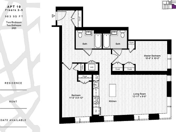 This sprawling 2 bedroom apartment features a spectacular living room with floor to ceiling corner windows and seamlessly integrated open kitchen with island. Split bedrooms offer true privacy and an ensuite master bath.. Enjoy multiple closets, an in-unit washer/dryer, and wood floors throughout.