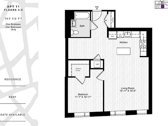 Spacious one bedroom with open kitchen with Caesarstone quartz island eating bar and stainless steel appliances, bright open living room, and bonus space perfect for separate dining area or home office. Apartment also features an in-unit washer/dryer, hardwood floors, and large walk-in-closet in master bedroom.
