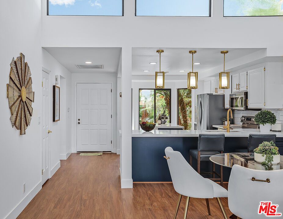 Don't miss an opportunity to see this stunning and recently remodeled two bedroom and two bath home. Offering approximately 1,330 square feet of livable space, this 20 Max Plan offers expansive Northwest views of 4 South fairway, pool and mountains. You will find updated laminate flooring throughout the living room, dining area and kitchen, fresh paint and upgraded baseboards throughout. A light and airy kitchen is highlighted by quartz countertops, subway tile backsplash, a center island and LG stainless steel appliances. The spacious living room features serene views of the patio and golf course. A bright primary suite offers a skylight, double vanity sinks and a full-height walk-in shower. The guest bathroom boasts a double vanity sink, tile flooring and a frameless shower enclosure. With 27 holes of golf and a Ted Robinson-designed course, Monterey Country Club offers one of the best values in the desert. Golf memberships are reasonably priced with no initiation fee to join the club! The second HOA fee features access to a full-service clubhouse, tennis and pickleball courts, a fitness center and 37 Pools and Jacuzzi's. Monterey Country Club is the ultimate desert experience.