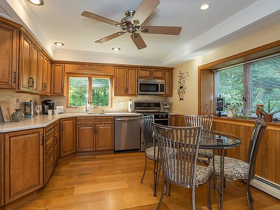 Step into a tranquil oasis! This home, embraced by trees, offers an inviting living room with wood stove, brick hearth, tray ceiling & recessed lights. French doors gracefully lead to a three-season sunroom boasting herringbone brick floor & vaulted ceiling. The first floor also features hardwood flooring, kitchen with stainless steel appliances & bay window, bedroom, full bathroom, laundry & an office nook with built-in bookcase. Upstairs, the primary bedroom awaits with its vaulted beam ceiling & access to a luxurious full bath with jetted tub, shower & skylight. Third bedroom with ceiling fan upstairs. Your outdoor space features perennial gardens, stone walls, post & beam covered deck & heated garage with finished second-story game room equipped with custom-made oak bar, Kegerator, mini-fridge, pool table & balcony overlooking the grounds. Seller states updates include new roof & skylight (2020) & new windows (2nd floor, 2021). This nature lover's paradise beckons you HOME!