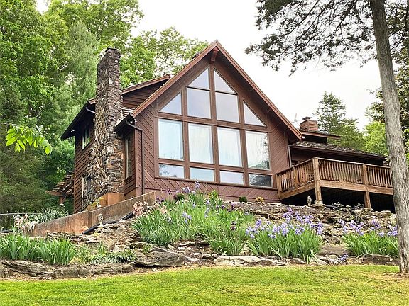 Enjoy a peaceful, private oasis of country living on over 18 acres. Custom-built, cedar home is lodge-like w/ 2x6 walls. Setting is stunning w/ view of 2.5 acre, stocked lake and landscaping from front windows and deck. Home has 2 bedrooms upstairs with spacious bathroom with jetted tub, skylight; third bedroom could be added in lieu of formal dining on main level. Great room has solid rock fireplace/hand-craved mantel; kitchen has cherry cabinetry, smooth top range. Full bath on main has shower. Walk-out unfinished basement. Newer features include pressure-treated deck on front, concrete patio/side walk, guttering, front door w/ lead glass side lights, garage doors, well pump/pressure tank. Washer, dryer, refrigerator stay. No pets or smoking in home. Outbuilding and shed (one housed motor home) offer ample storage and can be accessed with Seller's permission; stained glass does not stay. No covenants/restrictions. Perfect retreat for fishing, hunting, and being close to wildlife.