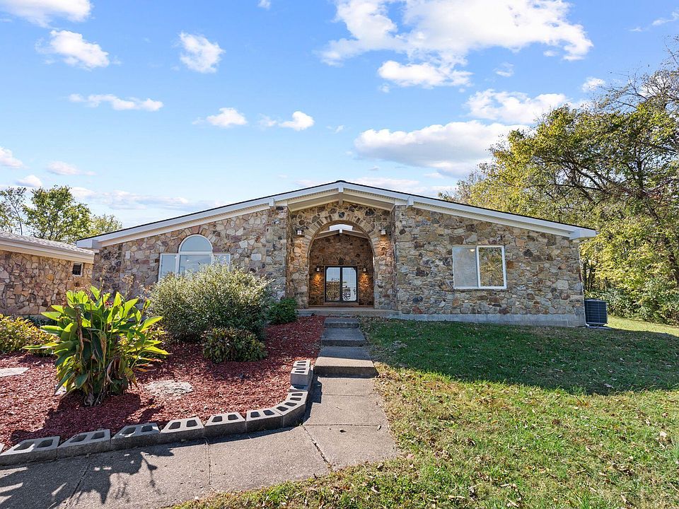 Set on serene and elevated acreage, this mini-farm offers panoramic views and is move-in ready for you to start the hobby farm you have always envisioned! The genuine all-stone ranch is set back off the road at the property's highest point and offers a year-round sunroom with vaulted ceilings, skylights, and abundant natural light, complemented by the warmth of the large wood burning stove with stone surround in the adjacent living room. The unique covered front entry is an excellent place to plant your flowering perennials/annuals, adding the perfect touch of elegance, and has been designed to conveniently water them when it rains. Additionally, the home features an extended kitchen with dedicated exterior back porch access and a spacious primary suite with a remodeled en-suite bath, along with two more bedrooms and a second remodeled bath. The large detached matching stone garage offers more than just parking. With ample space for at least a third vehicle, tractor, or ATV, it is also perfectly designed for a workshop. An extra building on the property offers flexible possibilities. Easily converted into a functional chicken coop for fresh eggs or a whimsical playhouse for children, this versatile structure adds even more value to your new homestead. Finishing out the property is a spring-fed pond, adding to the natural beauty and attracting local wildlife.