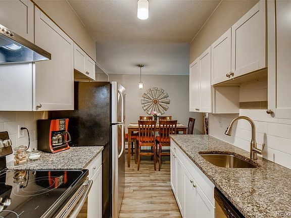 A perfect starter property that puts home ownership within reach! Welcome to Highline Meadows, a hidden gem tucked away in west Centennial, right by Littleton, surrounded by the Highline Canal and miles of trails. This amenity-rich community has a peaceful duck pond with fountain, swimming pool, clubhouse, tennis on site. Parks, public transportation, shopping, restaurants, and schools are all nearby. This spacious 1 bed/1 bath has been tastefully updated and well maintained. . Stainless steel kitchen appliances and granite counters. Kitchen opens to dining room which opens to the spacious living room, great for entertaining. South facing light from the sliding door leading directly to the 3rd floor balcony overlooking the green belt and looking down to the pond. Large primary bedroom with ample closet space. Updated bath with dual sinks! Laminate, tile and carpet flooring. Newer paint, impeccably clean and move-in ready. 3 closets in the property allow for good storage through out the unit. There is even a bonus storage locker in the building. A large one car detached garage is just a quick walk from the building front. The living is easy here! Truly an excellent starter home or investment property.