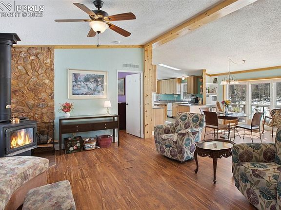 Surrounded by rolling meadows, large aspen groves, and mature pines this horse property in Florissant is the epitome of peaceful country living. Experience the joy of having a one-level home that is full of abundant light. It features numerous, large windows and desirable southern exposure for passive solar warmth in winter months. Well maintained and move-in ready with a fantastic floorplan providing a wonderful feeling of spaciousness! From the front door one will notice the easy flow between the living, dining, and kitchen areas. Perfect to live and entertain. The large kitchen features an island and separate breakfast area. In addition to a forced air heating system, the wood-burning stove in the living room heats the whole house efficiently and the property holds a plethora of forest trees for firewood! An owner's suite from the living room has a walk-in closet and luxurious five-piece bath. The large deck is perfect to relax and soak in the views or for overseeing the two separate horse pastures! The larger pasture has a seasonal natural spring and is adjoined by a large paddock with run-in shelter and automatic, heated waterer. Both pastures provide excellent meadow space and plenty of trees to protect your animals from the elements. The large detached workshop/garage is wired for electricity and can accommodate vehicles, still leaving room for a tack area and storage. An outdoor shed is nearby for additional storage. Find joy in outdoor pastimes with excellent gardening areas and your own 40 acres to explore. The location is only 45 minutes from Woodland Park and easily accessible from Florissant through county roads that are maintained year round. It has close proximity to Pike National Forest, Eleven Mile/Spinney/Terryall Reservoirs, and world class ski resorts for a multitude of recreation opportunities! The driveway is mostly level and easy to plow from the gate to the property. Don't miss the opportunity to live life on your dream homestead estate!