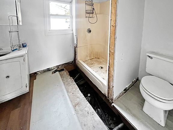 3 Bedroom 1 bath home will need improvements. Being sold as-is. Main level offers living room, kitchen, a large bedroom and full bath. Upper level offers 2 bedrooms. The bathroom floor has been partially removed - it appears that it was removed to access plumbing pipes.