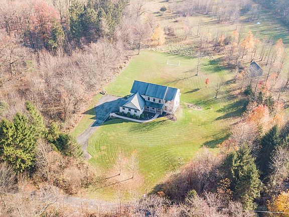 Welcome home! The opportunity to own this gorgeous 4BR 3/1BA custom home on over 5 acres is now available. Situated abutting thousands of acres of state game lands, this property is both private and serene. Enter the front door and you are greeted by a spacious hardwood floored foyer. Glass double doors take you into the study, which could have many other uses such as a playroom, etc. The hardwood flooring extends into the formal dining room, with extensive molding and large windows. The family room and kitchen are open to one another and have many large windows looking out at the beautiful landscape. The family room offers a gas burning fireplace with a floor-to-ceiling stone surround. The kitchen has a very attractive and functional layout. Some of the features include custom-made cabinets, Corian countertops, large island, stainless steel appliances, cooktop and double oven. There is a large walk-in pantry and adjacent powder room and mud room with washer and dryer on the main level. A perfect tucked away "drop zone" for backpacks, coats, boots, and is outfitted with custom cabinetry as well as a large sink. From the mud/laundry room there is access to the 3-car garage with built-in storage shelves (one bay is extended) and another access door to the driveway and yard. Head upstairs and you will find four bedrooms and three full baths. The master bedroom entry greats you with double doors and offers vaulted ceilings, large walk-in closet, and a luxurious ensuite bath with dual sinks, soaking tub, water closet, and a walk-in tiled shower. Two other bedrooms share a jack-and-jill bath with dual sinks with a separate door to the shower room for extra privacy. The fourth bedroom has an ensuite full bath and a walk-in closet. The basement of this home is unfinished and ready for your personal touch. With 10' ceilings, a large glass sliding door to your back yard and a full bath rough-in, this basement could easily be finished, or kept as-is for easy access to storage with its built-in shelving, directly from your back yard. A custom home of this quality does not often become available in such an idyllic setting. From the attractive stone front, to the Anderson windows, extensive recessed lighting, pre-wired security system, extensive outdoor lighting (driveway pre-wired), extended three car garage and more, this home won't last long. Don't miss the opportunity! Make your appointment today.