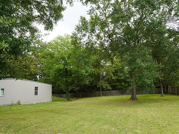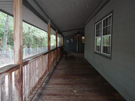 Real estate flyer design for a property at 280 Linn St, Onalaska, TX 77360. Features: 1990 mobile home with 2 bedrooms and 2 bathrooms on half an acre. Home includes partial deck, window A/C units, and will come with a new range and new water heater at closing. Spacious 2-car garage connected to unfinished rear construction with full bathroom and laundry room. Large fenced backyard with double gate access. Highlight: investment potential, extra space for projects, and privacy.