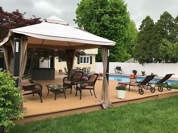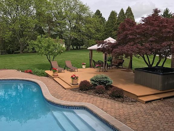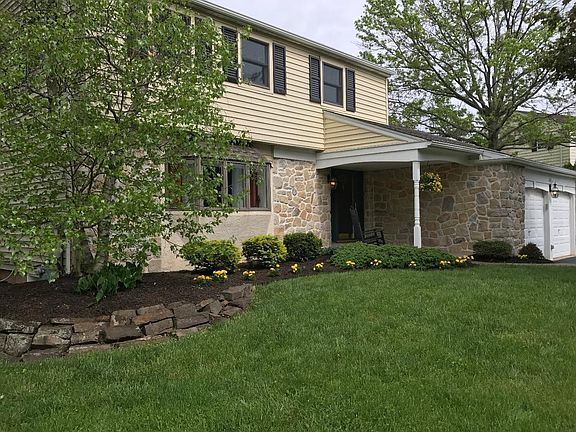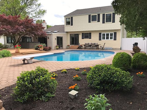 Beautifully modernized colonial home, upgraded and maintained in immaculate condition. Tasteful paint, trim, crown moulding and accents throughout! Outside, a backyard paradise for relaxation or entertaining, featuring attractive patio pavers surrounding concrete in-ground pool (recently re-plastered with new tiles and coping) lovely cabana on adjacent decking, complete with hot tub, fire pit, and attractively surrounded by flowers, ornamental trees and landscape edging! Enter home onto pristine hardwood flooring carried throughout main lower level area! Formal living and dining rooms, newly remodeled gourmet kitchen with maple cabinets, granite countertops and tile backsplash. Newer stainless appliances and mounted microwave. Enjoy coffee in the spacious eat-in area with sliders overlooking back patio, pool and yard! Sunken family room features full stone wall and slate hearth with fireplace, brand new carpet, soft natural lighting from the skylights, or slider door to the sunroom! This sunny area has new berber carpet and easily provides extra living space with 2 additional sliding doors to the backyard paradise! Powder room adjacent to tiled first floor laundry room with utility tub and cabinet storage, access to garage or door to side yard. Finished basement with powder room & additional closet storage. New electric panel plus utility area. Master bedroom with full tiled bath. Three other bedrooms (one with hardwood floors) and full bath with double vanity and jacuzzi tub/shower complete the upper level. Brand new roof, driveway, side walkway and central Air Conditioning! Located with convenience for any commute or shopping!