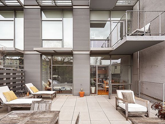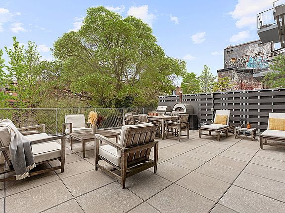 A lush private garden creates a stunning backdrop for this perfectly laid out home, with mature plantings, a dedicated gas line BBQ & pizza oven, water and electrical hookups and tons of blue sky. Arguably one of the building’s most unique features is its juxtaposition with adjacent Fillmore Place, the only landmarked block in all of Williamsburg. This unusual condition protects the views, light and air to the rear of 280 Met, allowing for incredible sun all day and charming views of beautifully restored brick townhomes. Other notable unit features include a large entry closet, custom window treatments throughout, cove lighting, fully built out closets and forced central A/C + heat through linear diffusers. The apartment was also just completely repainted!