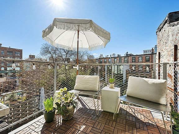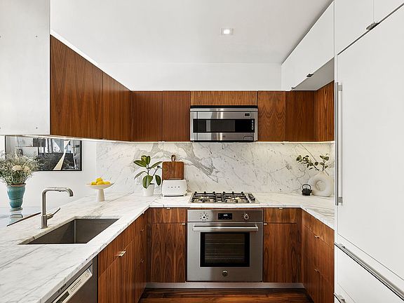 A large entry closet, custom window treatments throughout, built-out closets, central air conditioning, and heating, and access to a gym with an attached garden, a package and grocery delivery room, and a landscaped rooftop terrace with breathtaking Manhattan views. Parking and private storage are available in the building with a waitlist.