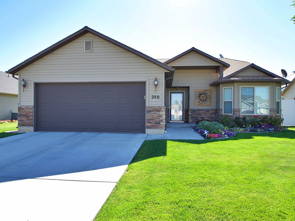 SIMPLY SPLENDID! This stunning home offers everything you need for comfortable living! Bright & open kitchen with gorgeous staggered cabinets and new sink & faucet, new exterior doors, new paint in living room. Cultured marble surround and garden soaking tubs in both bathrooms, walk-in closet in master bedroom. Beautiful landscaped yard, vegetable garden, huge covered patio with natural gas grill hook-up, and vinyl fence. R-60 insulation in attic. Heating and cooling ducts are in floor for excellent efficiency. Extra deep 2 car garage. Water-softener. Home warranty included.
