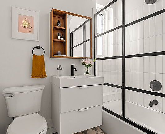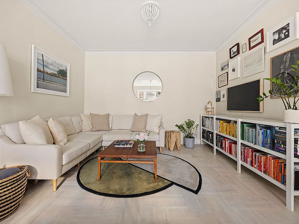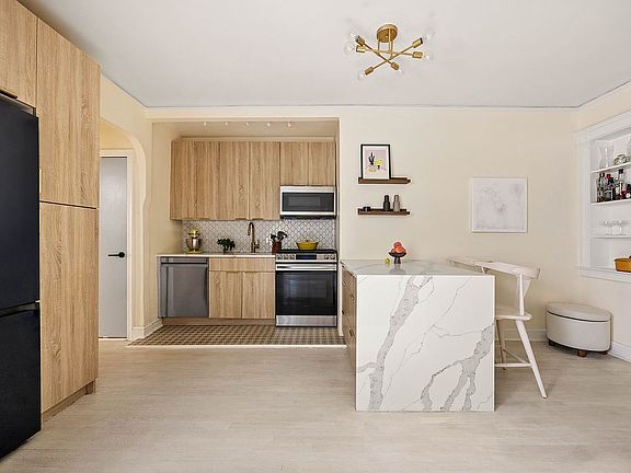 Urban minimalism meets Scandinavian charm in this fully renovated 1-bedroom, 1-bathroom apartment. Located on the 2nd floor of a well-maintained pre-war Co-op with soaring ceilings, this home offers a calming vibe with a modern twist. Kitchen features new cabinets and appliances, complemented by a built-in island that doubles as a bar for casual seating and a quick meal. Spacious bedroom boasts a built-in floor-to-ceiling closet maintaining the apartment's sleek aesthetic. In addition, four more deep closets are outfitted with Elfa closet systems to maximaze the storage space. The spa-like bathroom seamlessly blending style and functionality featuring trendy tiles, glass-enclosed bath and a floating vanity. Coop features new windows and updated elevators, along with a central laundry room, play room, additional storage (waitlist), and bike storage. The co-op welcomes cats and benefits from a live-in superintendent. The building is conveniently located near public transportation, including the F, G, and Q subway lines.
