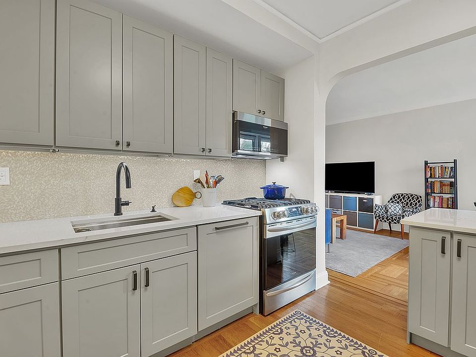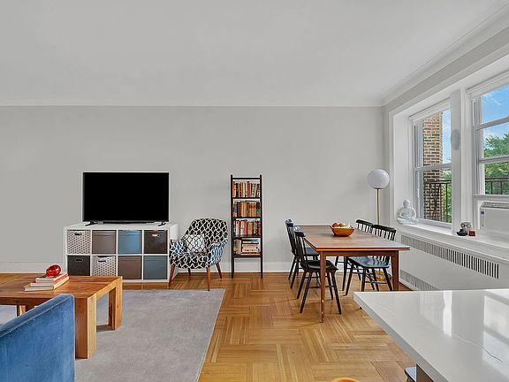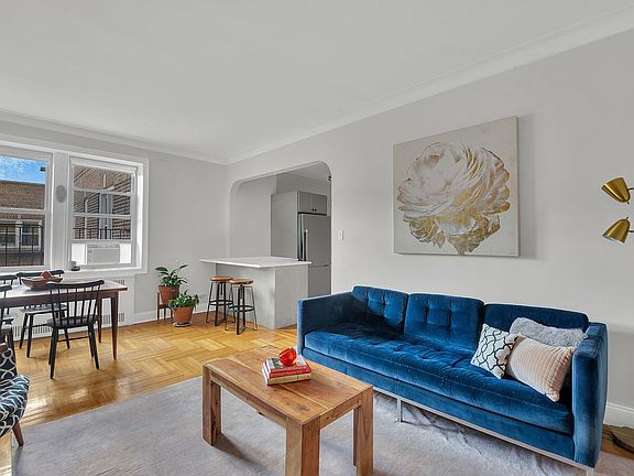 Newly renovated one bedroom pre-war coop not to be missed. The spacious custom kitchen features a breakfast bar seating two, glass mosaic tile backsplash, ample quartz counters, beautiful shaker cabinets with under-cabinet lighting, an integrated Bosch dishwasher, and stainless steel appliances. The bedroom is tucked away down the hallway away from the living room and kitchen. Four custom closets have been included as part of the renovation. Stunning hardwood floors with inlay details complete this perfect pre-war home.
