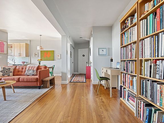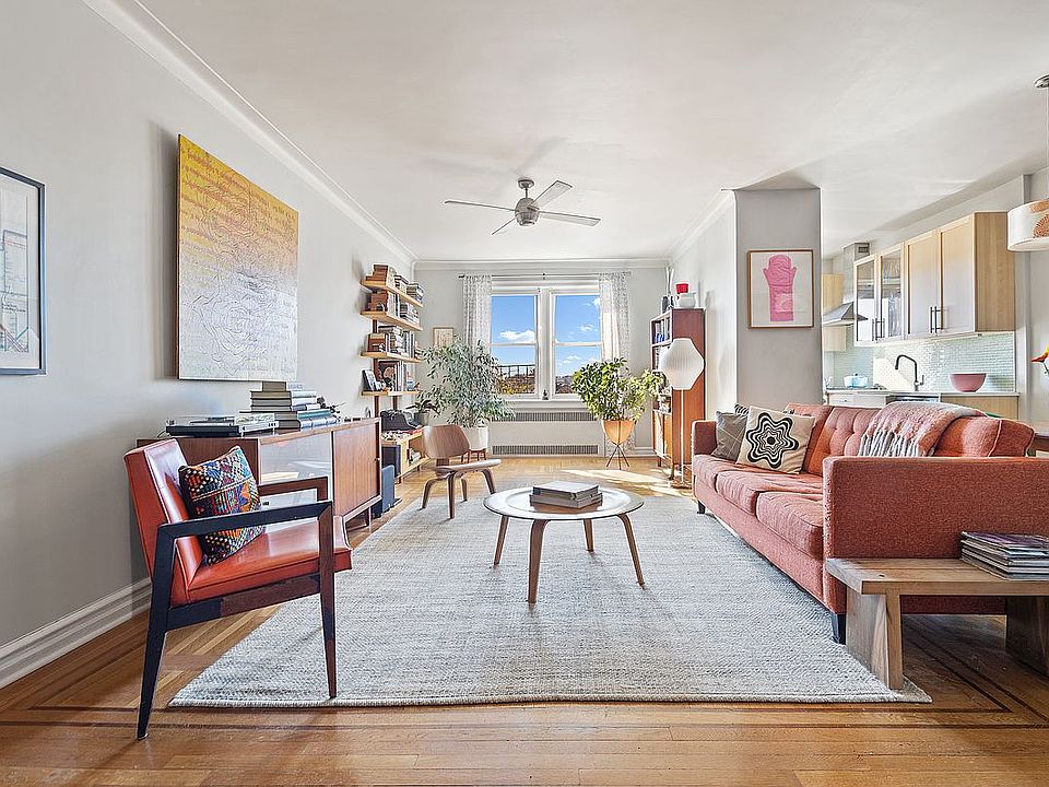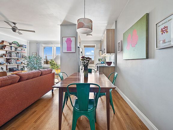 Dwell well in your home in the sky - in this beautifully renovated, top floor, CORNER two bedroom, one bath co-op. A gracious hallway entry complete with a large coat closet brings you into an expansive open floor plan living and dining room. The living room has plenty of space for all your belongings and then some. You'll be able to relax and entertain to your heart's content here. Imagine watching the sunset from your living room windows.