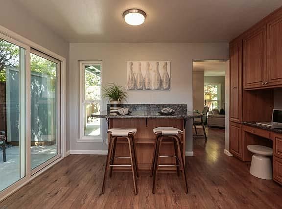 Updated dream townhome in move-in condition, freshly painted and new carpet, remodeled kitchen with granite countertops, new stainless-steel appliances, breakfast bar, pull-out pantry. Sunny dining area with sliding door to patio, large living room with charming wood burning fireplace, elegant ensuite master bedroom with spacious walk-in closet, private fenced backyard with slate patio & low maintenance landscaping and auto irrigation. Attached single car garage with epoxy auto-showroom style floor. Great location close to Castro Street/Downtown Mountain View shops & restaurants, CalTrain, Stevens Creek Trail & easy commuting distance to local tech companies. Award-winning public schools. Extra storage room available in garage loft, plus sturdy Tuff Shed on side yard. Enjoy occasional neighbor gatherings under the redwood trees in the Common Area. Rare opportunity in picturesque pet friendly community!