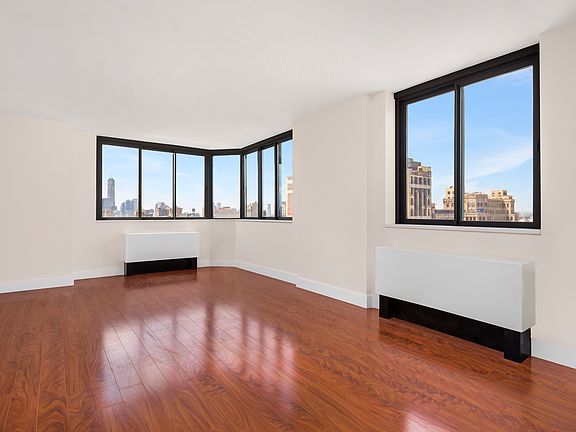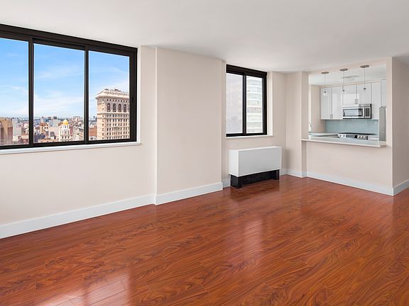 This one-bedroom apartment offers breathtaking views of the city skyline, with the living room and bedroom providing an unobstructed vista stretching to the World Trade Center. The windowed kitchen overlooks the Hudson River, and its original wall has been removed to create an open layout featuring a breakfast bar, wrap-around granite countertops, and Bosch appliances, including a dishwasher, microwave, and four-burner stove. The master bathroom has been completely renovated with new tiles, flooring, and a bathtub. The apartment also boasts ample closet space. Located in Gramercy Place, a premier luxury high-rise in the trendy Gramercy Park area, residents enjoy an exceptional amenities package. This includes a doorman, 24-hour concierge services, a rooftop pool, Jacuzzi, a newly renovated 24-hour fitness club, his-and-her sauna, steam, and locker rooms, and 360-degree views from two expansive rooftop terraces. The building also features a charming rear court play garden. Ideally situated on quiet, tree-lined 22nd Street, it is directly above the subway (6/N/R trains) and close to a 24-hour grocery store, drugstore, parking garage, and dry cleaners. Nearby attractions include Madison Square Park, Gramercy Park, Park Avenue restaurants, Flatiron shopping, Trader Joe's, Whole Foods, and the Union Square farmers market.
