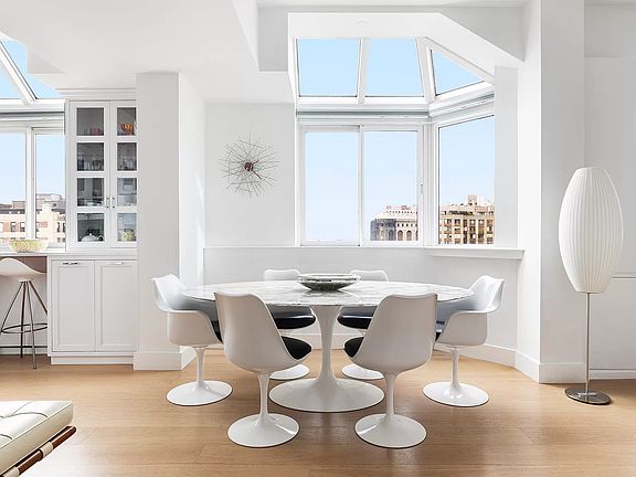 Welcome to this stunning corner penthouse located at 280 Park Avenue South, a full-service condominium, in the heart of Flatiron. This sun-flooded home is truly exceptional, with its almost 10-foot soaring ceilings and breathtaking views of the iconic Flatiron Building, One World Trade, MetLife Clocktower, Madison Square Park, and across the Hudson River to New Jersey. An entry foyer with 3 closets leads to the sunny living room with open western views, built-in bookshelves, and a separate dining area large enough for a table of 6. Off the living room is the kitchen, featuring stainless steel appliances (including a double drawer dishwasher and a built-in microwave), a plethora of storage, and bar seating where you can take in the incredible city and river views while enjoying your morning coffee. The primary bedroom is located off the foyer and has 2 closets, a wood-burning fireplace, a built-in desk overlooking Madison Square Park, and an ensuite bath with a glass-encased shower. Originally designed as an oversized 1 bedroom, the current owner thoughtfully reconfigured the floor plan to create a second bedroom, providing maximum versatility. The second bedroom can be found off the living room and faces both north and west. A second hallway bathroom with a tub services this bedroom and acts as a powder room for guests. Beautiful hardwood floors, recessed lighting throughout, and PTAC AC units complete this fabulous home. Gramercy Place is a post-war full-service luxury condominium with a brand newly renovated landscaped and furnished roof deck, rooftop fitness center with indoor pool/Jacuzzi/sauna/steam room, garden, laundry room and bike room. The building is located in the center of Flatiron near fabulous restaurants and shopping, public transportation, and Union Square, Madison Square Park, Chelsea, Meatpacking, and much more. Pets and pieds-a-terre are welcome.