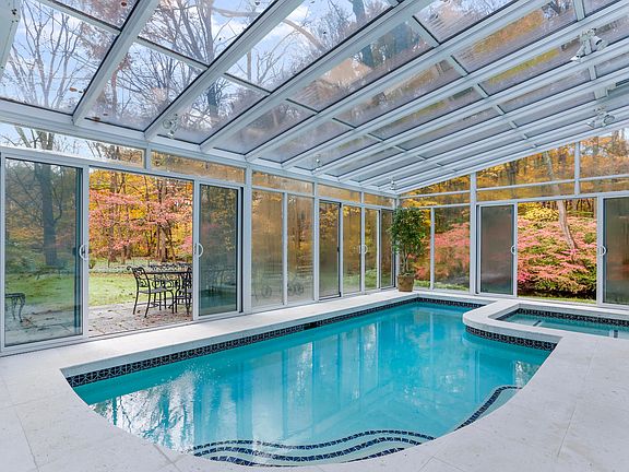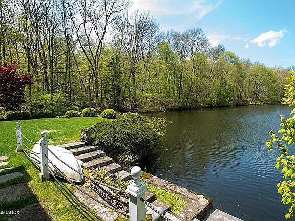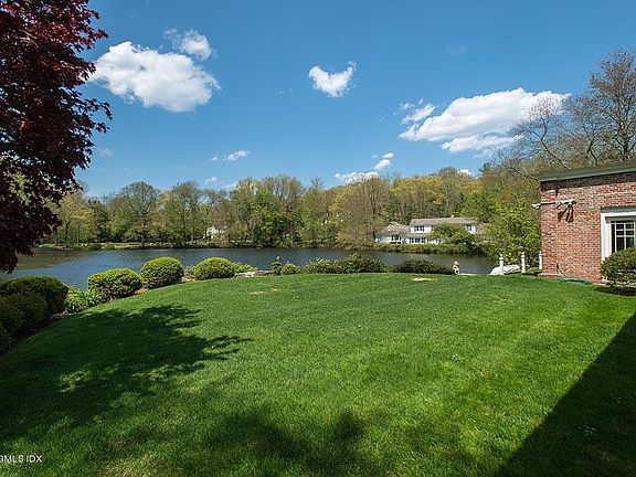 Lakefront. Sweeping lawns lead to the stone courtyard of this very special home with a glass enclosed indoor pool and beautiful views of the lake that is wonderful for fishing and kayaking. A spacious entrance hall with limestone flooring opens to the large living room with fireplace, dining room and mahogany paneled library with fireplace. There is a gourmet kitchen/ adjacent family room with fireplace, an office with adjacent bath and first floor master bedroom suite. The second floor has 3 bedrooms and 2 baths. This home is full of light and has exceptional water views.