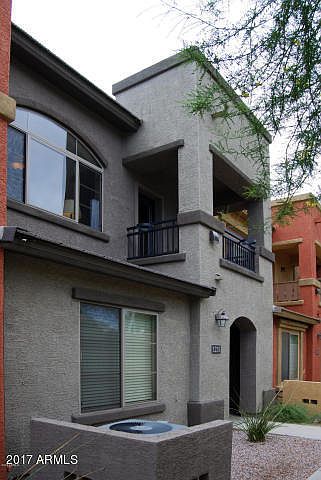 Sharp home with many upgrades! Ideal two bedroom split plan with the master bedroom upstairs and other bedroom downstairs. Quality cabinetry throughout, granite in the kitchen, with wood flooring, tile and carpet only on the stairs. Separate dining room, breakfast bar and spacious great room with exit to balcony. Inside laundry with stack units and large double garage. A/C replaced in September of 2020. Gated community in a great location with heated pool and spa. Close to the 101, ASU and shopping, and across the street from Chicago Cubs training facility.