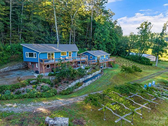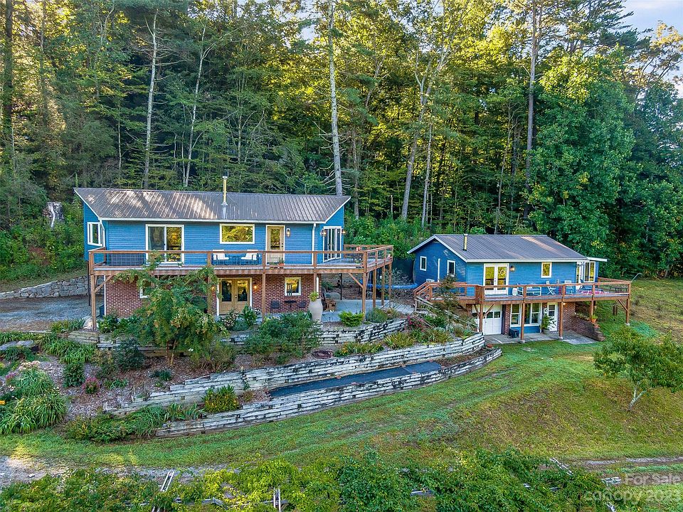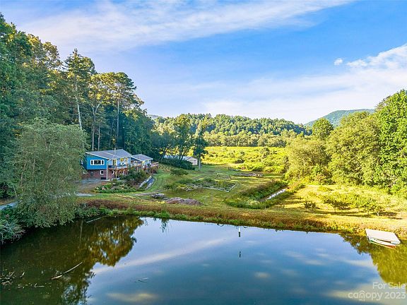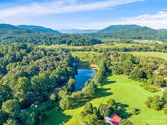 Homestead/Hobby Farm with over 18 acres, 2 homes, private 2-acre pond stocked with bass and has a small floating dock. Private access to French Broad River w/graded ramp. Mature landscaping with over 50 apple and peach trees, plus raspberry bushes, blueberry bushes and raised garden beds. Main home has 3 BRs, 2.5 BAs, wood burning stove, open concept living room + kitchen with island, large deck and patio to enjoy fantastic sunsets, wildlife, and beautiful mountain views!! Energy-efficient geothermal HVAC, New Windows, New Hot Water Tank, Metal Roof, and Radon Mitigation System. Guest Home offers 1-BR, large BA, full kitchen, living room with wood burning stove, sunroom, and large front porch. Property includes a large metal barn to store your equipment, 2-chicken coops and much more. Privacy and Seclusion, yet only 5 min from shopping. Home has High Speed Internet. Property is in the flood zone, Seller to provide Elevation Certificate. NO DRIVE BYS *ALL OFFERS DUE BY 5PM SATURDAY 9/9