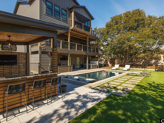 The mid-level offers four beautifully designed bedrooms (one currently configured as a den and home office), each with porch access, along with two spacious shared baths. A shaded porch with a daybed and porch swing overlooks the pool and lush backyard, creating a peaceful retreat. The well-appointed laundry room features DOUBLE WASHERS AND DRYERS, quartz countertops, custom cabinetry, and a TILED PET BATH.