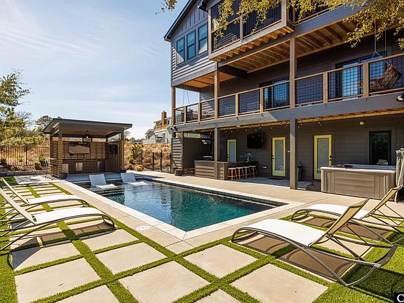 The lower level is designed for entertainment and convenience, featuring a LOUNGE WITH KITCHENETTE AND WET BAR, and a bath with direct pool access. A large bedroom on this level offers flexibility as an additional den or guest retreat. Dual garages provide ample storage, with one perfectly sized for a golf cart or personal watercraft.