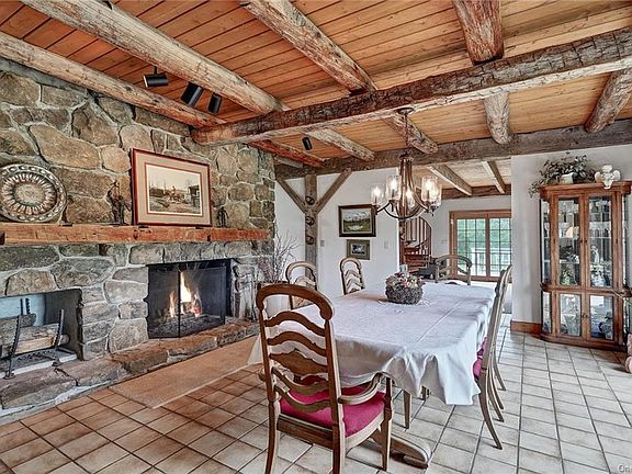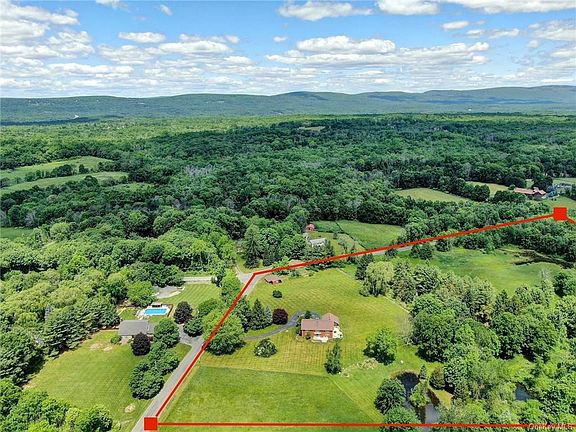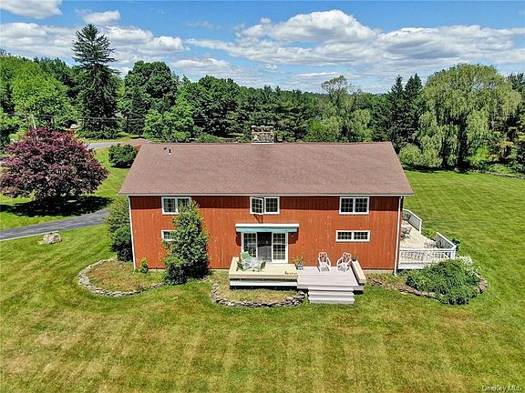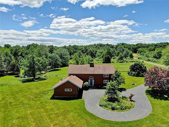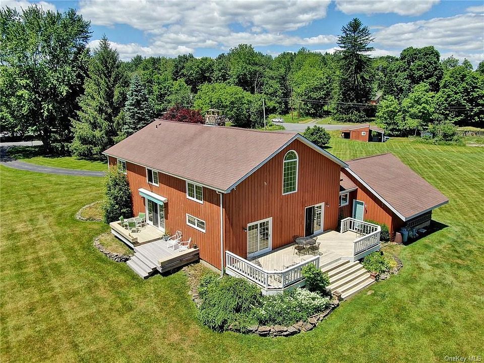One of a kind custom built contemporary, two level home with hand hewn wooden beams throughout. Dramatic cathedral/vaulted entry way with natural stone two level wall and stunning two story living room/great room. Constructed using mortise and tenon methods, utilizing wood beams from the original c1800s barn on the property. Open floor plan and views galore. Kitchen has Garland propane stove and beautiful cherry cabinets. A formal dining room with large natural stone fireplace, wide planked hardwood and stone tile floors. Balcony with open loft and spiral staircase. Upstairs boasts a large master bedroom with natural stone wall, loft area, two bedrooms, full bath with luxurious tub and vaulted ceiling. Two large outdoor decks overlook the expansive 15 acre property. The property includes 3 fish filled ponds, several open cleared fields, perennial gardens and barn workshop with 220 electric and water. Your upstate retreat is waiting for you!