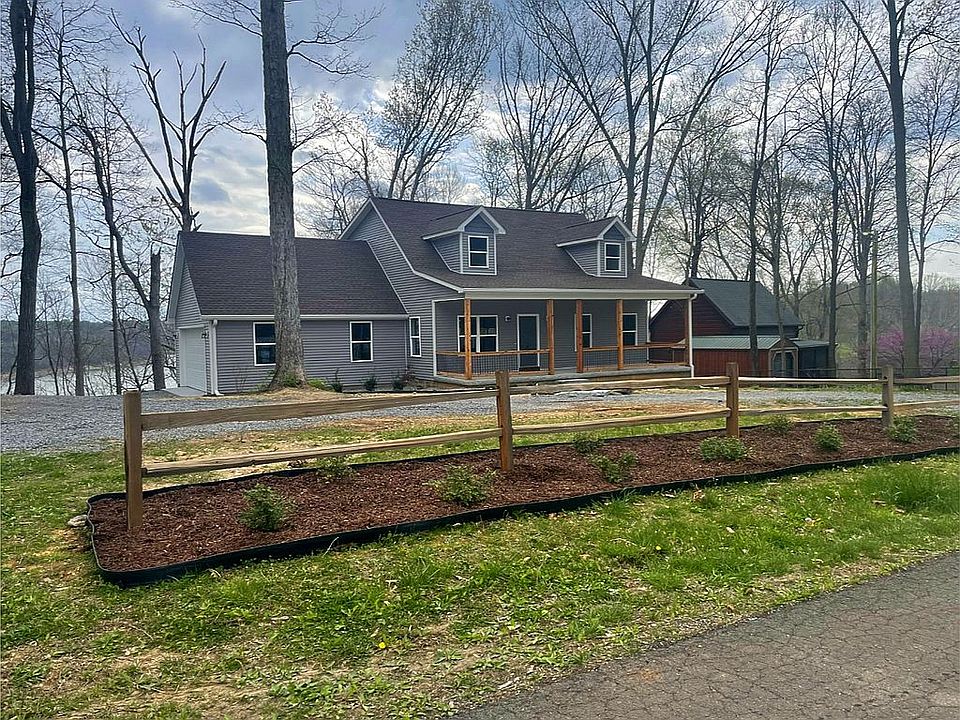 Beautiful lakefront home! This three bedroom two and a half bath home has many upgraded amenities. Hardwood and tile flow throughout the entire home! The great room offers a 20' tongue and groove ceiling with a floor to ceiling beautiful stone fireplace with gas logs. The large bright kitchen features lots of cabinetry withs oft close doors and drawers, including a pantry cabinet, an island, granite countertops, Travertine tile backsplash and a stainless appliance package including a French door refrigerator with an ice/water dispenser, deli drawer, and a bottom freezer. The adjoining dining room has French doors leading out to the 12' x 35' deck. The utility room also houses a half bath and comes with a nice utility sink and a washer and dryer! The main bedroom is on the ground floor and has a large walk in closet with upgraded Freedom Rail shelving. The main bathroom features tile flooring, a two person walk-in tiled shower with ADA compliant adjustable handheld shower slide bars, dual vanities with granite countertops, and beautiful mirrored medicine cabinets that are mirrored inside, as well. Upstairs there is a loft bedroom that overlooks the great room with sliding barn doors, and has a vaulted tongue and groove ceiling, and French doors that open out onto the covered, private 12' x 35' deck with Western cedar gables. There is a big jack and jill type tiled bathroom with a tiled shower surround and an ADA compliant sliding handheld shower bar. The third huge bedroom has a big walk in closet and two storage dormer cubbies. The front porch features stamped concrete and Western cedar porch railings. The side entry two car garage also offers a side passage door. The pretty landscaping also features a split rail fence lined with Knockout roses and a circle drive. Under deck storage, too! Conveniently located near Walnut Creek Marina and the Brownsford Road boat ramp. An additional lot may also be available. Owner/agent. Please text.