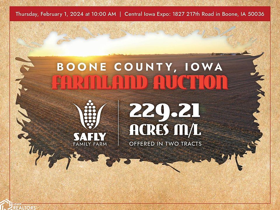 Boone County, Iowa Farmland Auction – Mark your calendars for Thursday, February 1st, 2024! I'm pleased to represent the Dean & Loraine Safly Family Farm consisting of 229.21 acres m/l of high-quality Boone County, Iowa farmland located just southeast of Luther, Iowa. Since the mid-1800s, the Safly farm has had continuous family ownership and is eligible for the coveted Century Farm award, which celebrates long-time tenured farmland ownership of more than 100 years. Production agriculture and Boone County farmland go hand in hand and the Safly farm continues that tradition with top producing soils and seed corn contract rotation for the last 15+ years. This 100% tillable farm will be offered as two individual tracts through the Buyer’s Choice Auction Method where the high bidder can elect to take one or both tracts. Both farmland tracts predominantly include clay loam soil types of Nicollet, Canisteo, and Clarion with CSR2 soil ratings exceeding the Boone County average CSR2 soil rating of 75. The farm has been operated by the same tenant for several years. The farm lease has been terminated and will be open for the 2024 crop year. Tract 1: 89.21 Acres m/l with 89.2 FSA cropland acres and a CSR2 soil rating of 86.4. Tract 2: 140 Acres m/l with 140.29 FSA cropland acres and a CSR2 soil rating of 85.3. Visit our website for more information regarding this 2 Tact Auction!