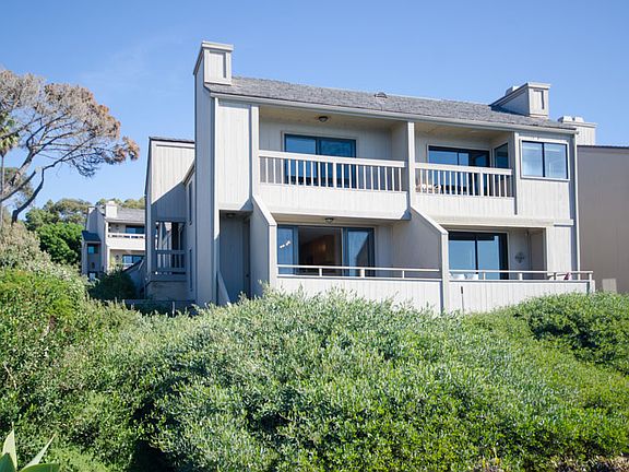 Oceanfront, corner unit in Del Mar Woods. Fantastic ocean and shore views!! HOA with pool, spa and tennis. Attached 2 car garage with lots of storage. Upgraded kitchen with custom cabinets and granite counter tops. Private beach and bluff entry from the patio.