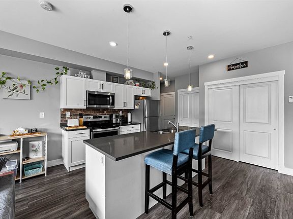 Southeast facing upper level corner unit will impress from the moment you walk in. Situated above the tree line, with incredible views, this 2 bedroom, 1 bathroom unit has an open concept feel and will make you feel at home. Freshly painted 2025 & built in 2019, this property still has 4 years remaining on the Revitalization Tax Exemption, which saves you on property taxes. In the kitchen you have a large island and a great area for cooking and gathering with friends. 2 large bedrooms with windows encasing the rooms, lots of natural light. Nicely appointed 4 pc bathroom and plenty of storage in the unit as well. The patio is 100sqft and provides plenty of space to relax and enjoy the sunsets. Above the unit is a large common area roof-top patio. The strata fees are 455.33/month, pets and rentals permitted. This unit is conveniently located close to Bright Eye Brewing, Rivers Trail, Logjam Coffer, 5 Bean Brew Bar, Kamloops Art Party, Red Beard Cafe and only minutes from the beach and MacArthur Island and TRU. This property comes with 1 secured parking space and common bike storage. Quick Possession is possible.