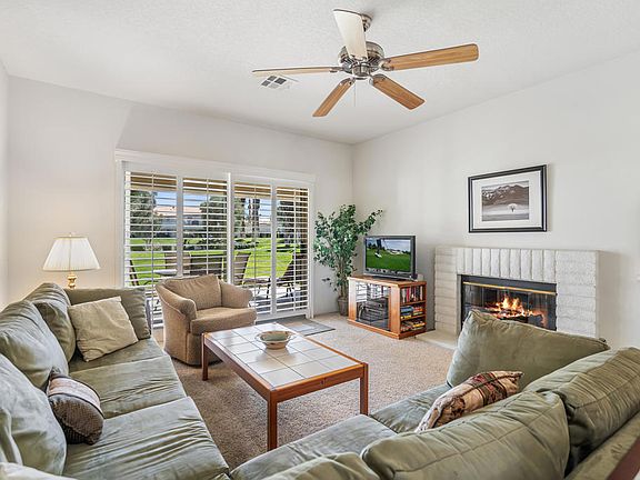 Enjoy the peacefully greenbelt setting with views of the trees and HUGE pool just steps away from this GROUND LEVEL 2 bedroom 2 bath condo in Desert Falls C.C. Featuring beautiful slab granite kitchen counters, stainless steel appliances, light maple cabinetry and cozy fireplace in the family room. The large primary suite also has slab granite counters, dual vanities, custom cabinetry and a French door to your sunny covered rear patio with views. Additional upgrades include Plantation shutters, garage storage cabs, replaced A/C unit, water heater and garage door opener. Desert Falls C.C. features an 18 hole golf course, pickle ball & tennis courts, fitness center, pools, clubhouse restaurant and more. Centrally located in the Coachella Valley. close to fabulous dining, shopping, Accusure Arena, Indian Wells Tennis gardens, casinos and great golf courses.