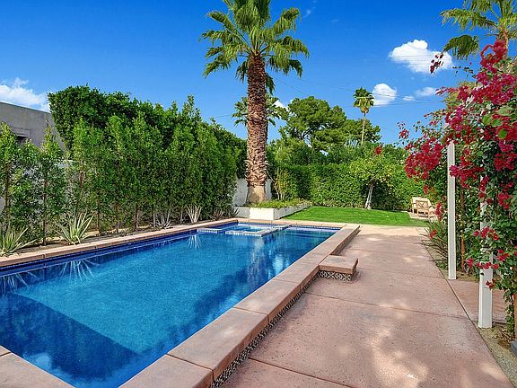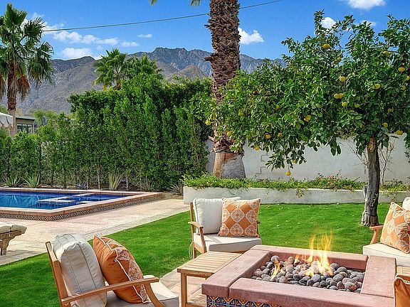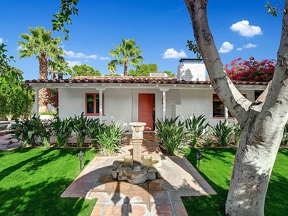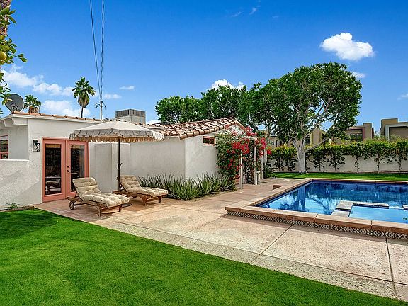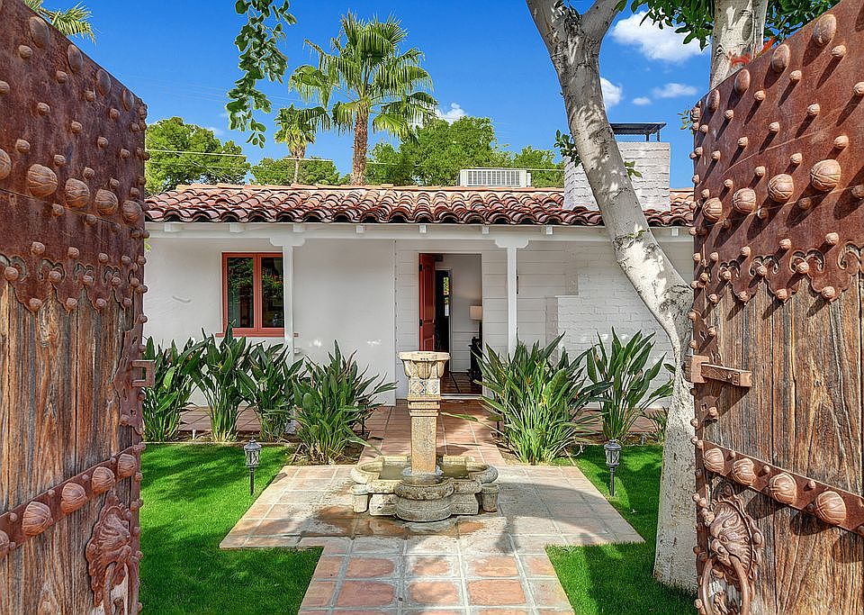 One of a kind 1938 Spanish Colonial. This well-kept, restored & updated 3BD/2BA home is one of the most captivating, charming + adorable homes in Palm Springs. Be seduced by the unique wooden gate framed by a mission style arch. A lovely stone fountain welcomes you to the front patio, perfectly manicured tall landscape, Ficus hedges, trees, verdant grass contrasts w/ the bougainvillea. The Saltillo pavers lead you to an inviting front porch, Spanish roof tile, a stone brick chimney. A delightful interior offers a brick fireplace w/decorative tiles, tongue & groove white beamed pitched ceilings, both the En-Suite BD w/renovated full BA + the BD/Den opens to the pool/spa; remodeled Chef's kitchen w/decorative backsplash, high-end commercial grade appliances, wine cooler, opens to an enchanting bright dining area. The 3rd BD en-suite/guest quarter could be rented out w/separate entrance. Every room opens to the garden. Entertain al-fresco dining parties w/guests sitting at the outdoor table, by the cozy colorful tile fire pit, by the pool, or by the rooftop enjoying breathtaking views of the San Jacinto Mts. Just magnificent sunsets! Spanish homes are known for their timeless style, insulation, and indoor-outdoor living. Perfect for a full-time/part-time/great potential income as a short-term investment. 3 HVAC zones. Near world-famous landmarks. Just a short bike ride to everything: Uptown Design District, Downtown, shopping, dog park, hiking/biking trails. YOU OWN THE LAND.