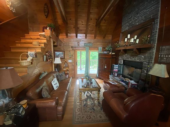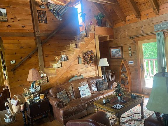 Peaceful living on the Cumberland River is what you will experience with this 3 bedroom 2 bath log home! Property consists of 2.37 acres by survey with creek frontage, 500 ft of river front property with steady slope leading to the Cumberland River (perfect for fishing in your back yard) & a level front yard with mature shade trees. This log home boasts vaulted ceilings, hand hue log beams thru out the home, a floor to ceiling stone see thru fire place in the living room & kitchen, walnut hardwood flooring, solid wood doors, partially finished basement with living room, bathroom, laundry room, bedroom with French doors leading out to the pool area. Enjoy entertaining on the covered back porch with vista river views or take a venture to the front porch by the wrap around covered porch. A picnic shelter area is designed leading off the side covered porch which will help entertain any group gathering. Partly Furnished so you can move into. Water privilege's convey to the Cumberland Reserve launching ramp with an annual HOA fee. Enjoy peaceful & relaxing living at this one of a kind property located in Cumberland County, Kentucky.
