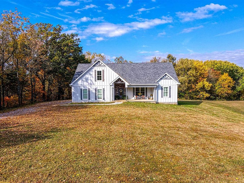 Beautiful custom home built in 2022 on 8 acres. Scenic country views. Trees border the perimeter with the majority of the property being open yard/pasture. Perfect place to create your own mini-farm. Open concept layout with a split bedroom plan. The bonus room is currently being used as a 4th bedroom but could be a perfect family/media room. The kitchen has a huge breakfast bar, lots of granite countertop space, a multitude of cabinets, and a walk-in pantry. The combined dining and living area are perfect for family and friend get-togethers. You will love the gas fireplace as we enter the colder months. The home has 2 covered porches. If you are looking for peace and quiet and a lot of space, this may be just right for you!