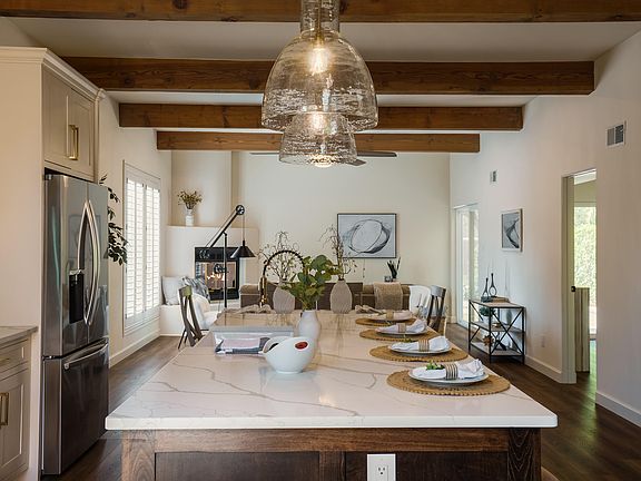 Welcome to your stunning retreat in the coveted Thomas Village community. This recently remodeled gem boasts a blend of modern elegance and Southwest charm, making it a standout in its class. Upon entering, you're greeted by a newly paved, picturesque private front courtyard. The heart of the home is a chef's dream kitchen, meticulously designed with custom two tone cabinets, a built-in oven, and a separate coffee or wine bar for the ultimate convenience. The kitchen is adorned with custom tile work and countertops, creating a perfect harmony of style and functionality. Inside, discover smooth texture walls with bullnose corners and a cozy fireplace. The bathrooms feature floating quartzite counters with curbless walk-in shower with custom tile design and disable frameless mirrors.